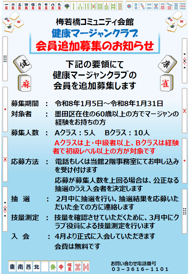【健康マージャンクラブ】会員追加募集のお知らせ